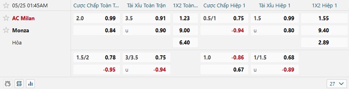 Bảng tỷ lệ kèo bóng đá AC Milan vs Monza