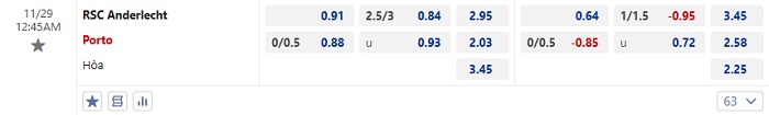 Bảng tỷ lệ kèo bóng đá Anderlecht vs Porto
