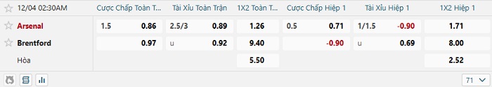 Bảng tỷ lệ kèo bóng đá hôm nay Arsenal vs Brentford