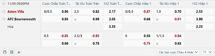 Bảng tỷ lệ kèo bóng đá Aston Villa vs Bournemouth