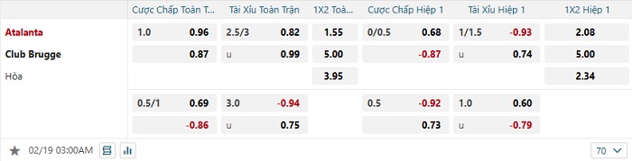 Bảng tỷ lệ kèo bóng đá Atalanta vs Club Brugge