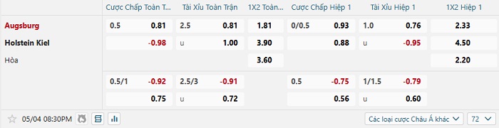 Bảng tỷ lệ kèo bóng đá Augsburg vs Holstein Kiel