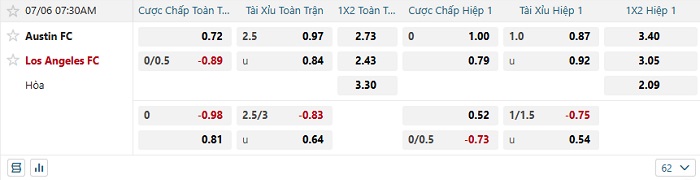 - Kèo tỷ số H1 Austin FC vs Los Angeles FC: 0-0
