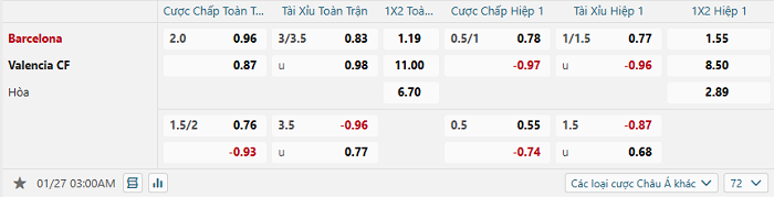 Bảng tỷ lệ kèo bóng đá Barcelona vs Valencia