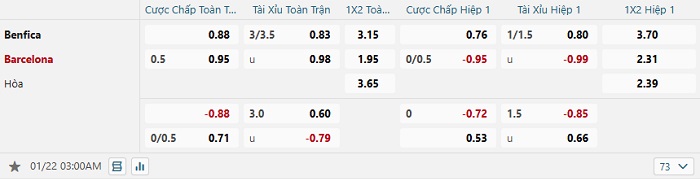 Bảng tỷ lệ kèo bóng đá Benfica vs Barcelona