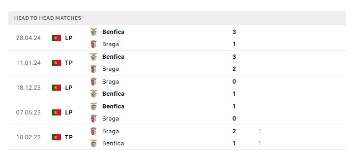 Phong độ gần đây Benfica vs Braga