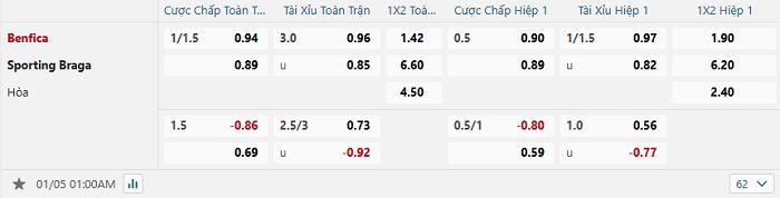 Bảng tỷ lệ kèo bóng đá Benfica vs Braga