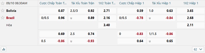 Bảng tỷ lệ kèo bóng đá hôm nay Bolivia vs Brazil