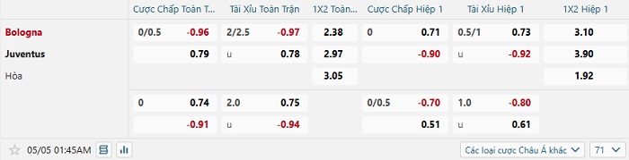 Bảng kèo bóng đá Bologna vs Juventus