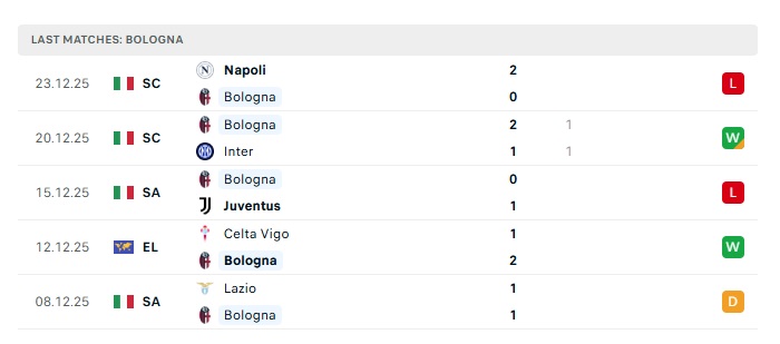 - Phong độ gần đây Bologna