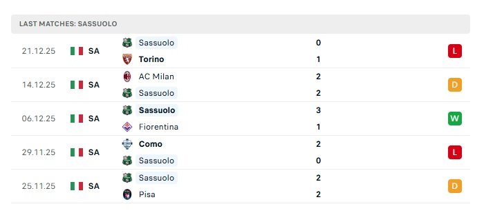 - Phong độ gần đây Sassuolo