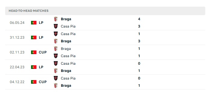 Lịch sử đối đầu Braga vs Casa Pia AC