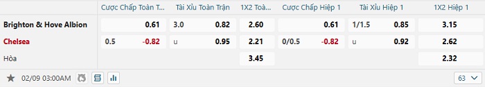 Bảng tỷ lệ kèo bóng đá Brighton vs Chelsea