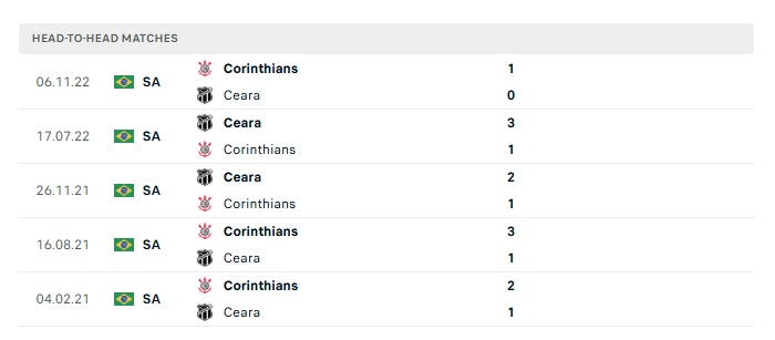 Lịch sử đối đầu Ceara vs Corinthians/SP