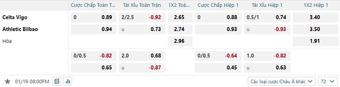 Bảng tỷ lệ kèo bóng đá Celta Vigo vs Athletic Bilbao