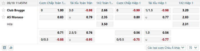 Soi kèo châu Á, kèo Club Brugge vs Monaco