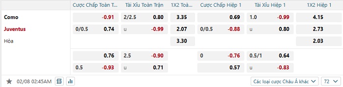 Bảng tỷ lệ kèo bóng đá Como vs Juventus