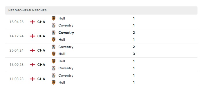 Năm ngoái, hai đội đã có những kết quả thi đấu hoàn toàn trái ngược nhau và Hull City chính là bên lép vế hơn hẳn đối thủ. Cần biết rằng Coventry hiện tại được ghi nhận đã có mặt ở vị trí thứ 5 trên BXH mùa trước. Trong khi đó thì Hull City đứng ở tận vị trí thứ 21. Do đó, nếu xét về chuyên môn thì rõ ràng đội chủ nhà đang cầm chắc phần thắng trước đối thủ ở trận đấu hôm nay.