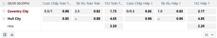 Bảng kèo bóng đá Coventry vs Hull City