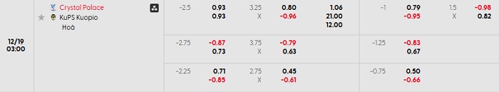 Bảng tỷ lệ kèo bóng đá hôm nay Crystal Palace vs KuPS