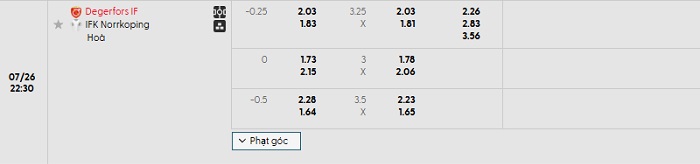 Hiện tại, nhà cái đưa ra cho Degerfors mức chấp -1/4 và khả năng để họ thắng kèo là rất thấp. Trong 4 lần đụng độ nhau gần nhất của hai đội, Norrkoping đã thắng kèo đến 3 và chỉ thua 1. Song song đó thì 10 trận đã qua của Degerfors, họ chỉ thắng kèo 1, hòa 1 và thua 8. Do đó, các chuyên gia đều khẳng định rằng Norrkoping đang là lựa chọn đầu tư an toàn nhất dành cho người hâm mộ.