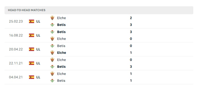 Lịch sử đối đầu Elche vs Betis