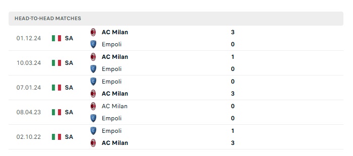 Lịch sử đối đầu Empoli vs AC Milan