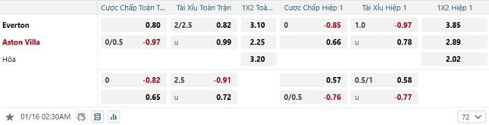 Bảng tỷ lệ kèo bóng đá Everton vs Aston Villa