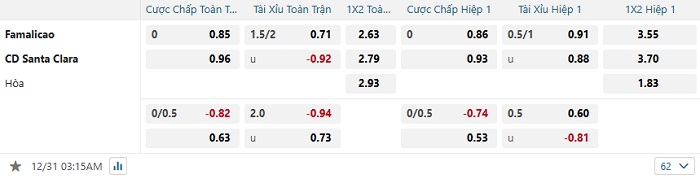 Theo nhiều nguồn tin thì hiện tại, nhà cái đang chỉ đưa ra mức kèo đồng banh cho hai đội. Nên biết rằng trong 7 trận đấu gần nhất của Santa Clara, họ chỉ có 2 lần thất bại và còn lại là 5 thắng kèo. Hãy nhớ rằng trong 6 trận đấu gần nhất của chủ nhà Famalicao, họ chỉ thắng kèo 2 và thua đến 4. Do đó, kèo châu Á trận đấu hôm nay sẽ khép lại với đội khách là lựa chọn an toàn nhất trong cả 2 hiệp thi đấu.