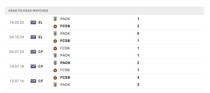 Phong độ gần đây FCSB vs PAOK
