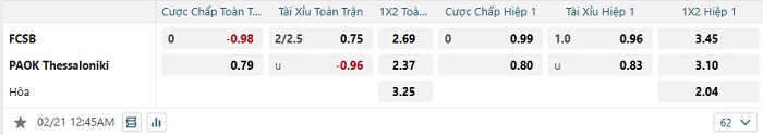 Bảng tỷ lệ kèo bóng đá FCSB vs PAOK