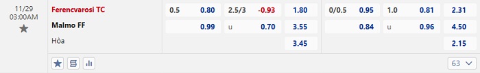 Bảng tỷ lệ kèo bóng đá Ferencvaros vs Malmo