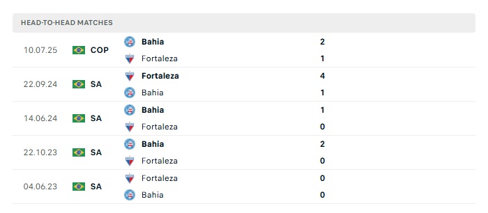 Lịch sử đối đầu Fortaleza vs Bahia