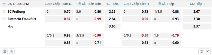 Bảng tỷ lệ kèo bóng đá hôm nay Freiburg vs Ein.Frankfurt
