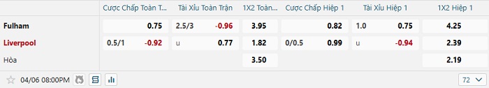Bảng tỷ lệ kèo bóng đá Fulham vs Liverpool