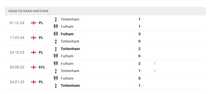 - Kèo tỷ số H2 Fulham vs Tottenham: 1-1