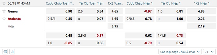 Bảng tỷ lệ kèo bóng đá hôm nay Genoa vs Atalanta