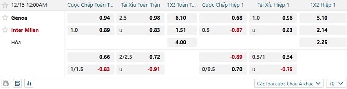 Bảng tỷ lệ kèo bóng đá hôm nay Genoa vs Inter Milan