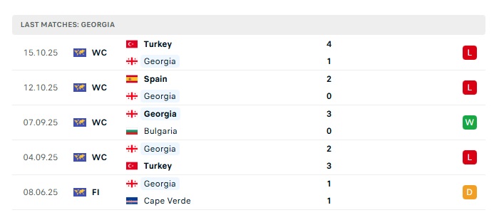 Phong độ gần đây Georgia vs Tây Ban Nha