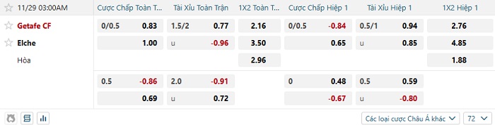 • Kèo tỷ số H1 Getafe vs Elche: 0-0