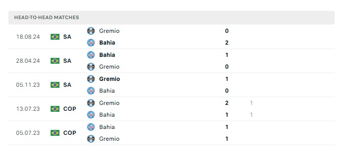 Lịch sử đối đầu Gremio vs Bahia