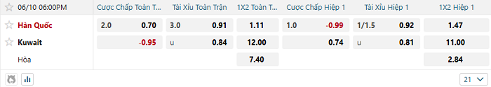 - Kèo tỷ số H2 Hàn Quốc vs Kuwait: 3-0