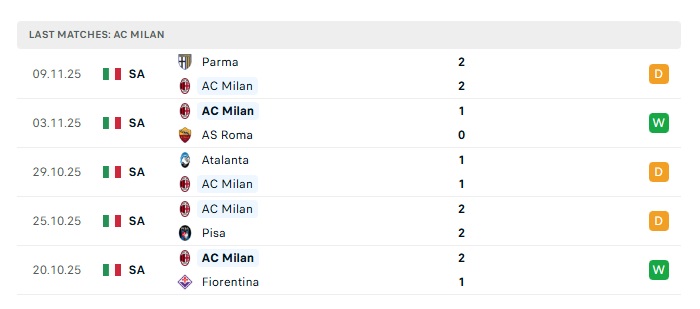 • Phong độ gần đây AC Milan