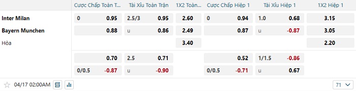 - Kèo tỷ số H1 Inter Milan vs Bayern Munich: 0-0