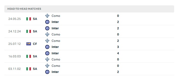 Lịch sử đối đầu Inter Milan vs Como