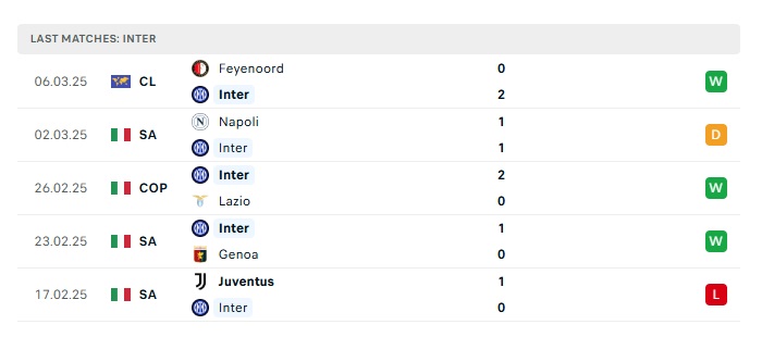 Hiện tại, phong độ thi đấu của Inter Milan vẫn đang rất cao so với đối thủ trong thời gian qua. Cụ thể thì Inter Milan đã thắng 4, hòa 1 và chỉ thua 1 trong 6 trận đấu gần đây nhất của mình. Trong khi đó thì Feyenoord đang chỉ thắng 2, hòa 3 và thua 1 trong 6 trận đấu gần đây nhất. Qua đó, các chuyên gia đều tin rằng đội chủ nhà sẽ tiếp tục dễ dàng đánh bại đối thủ ở ngày thi đấu hôm nay.