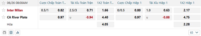 - Kèo tỷ số H2 Inter Milan vs River Plate: 1-0