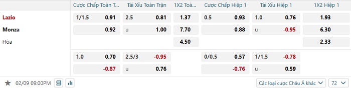 Bảng tỷ lệ kèo bóng đá Lazio vs Monza
