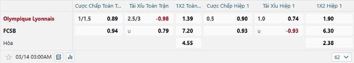 Bảng tỷ lệ kèo bóng đá Lyon vs FCSB