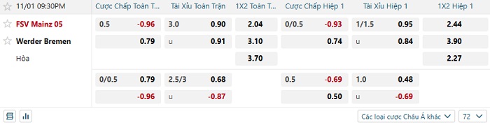 Soi kèo châu Á, kèo Mainz vs Werder Bremen